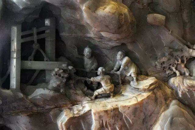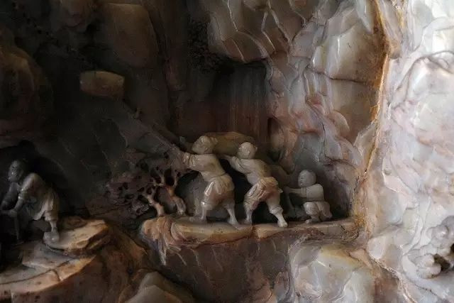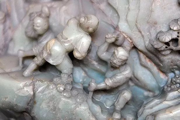 整座玉山上,雕琢了众多人物,活动都围绕治水展开,人们穿着粗布麻衣,有的干脆光着上身,抡起橛子,劈山移土,脊背、腿上的肌肉随着动作的展开爆发出力量。