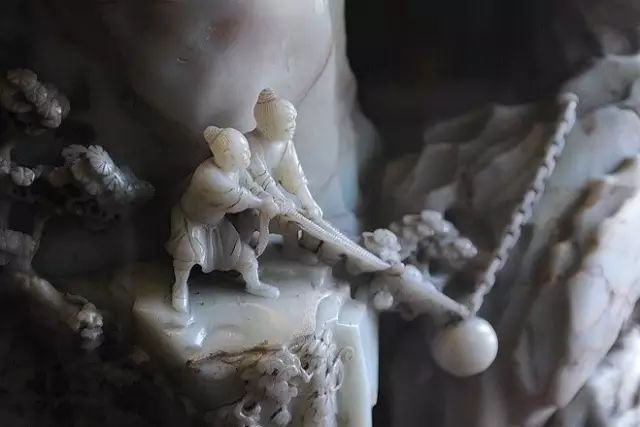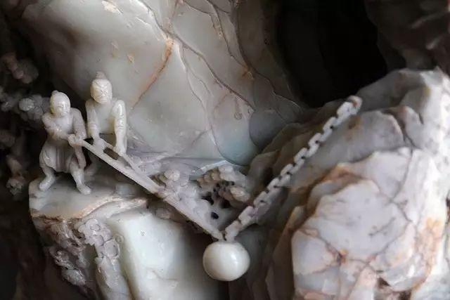 玉器的雕刻,最考验玉匠的功力。玉匠必须根据玉石的形状和纹理,构思整体效果和细节。《大禹治水图玉山》参考清宫收藏的一张《大禹治水图》,在玉山之上,雕刻悬崖峭壁、飞流瀑布、花木古松和成群的劳动者,场面紧张热烈,体现着先民们开山治水的信心。